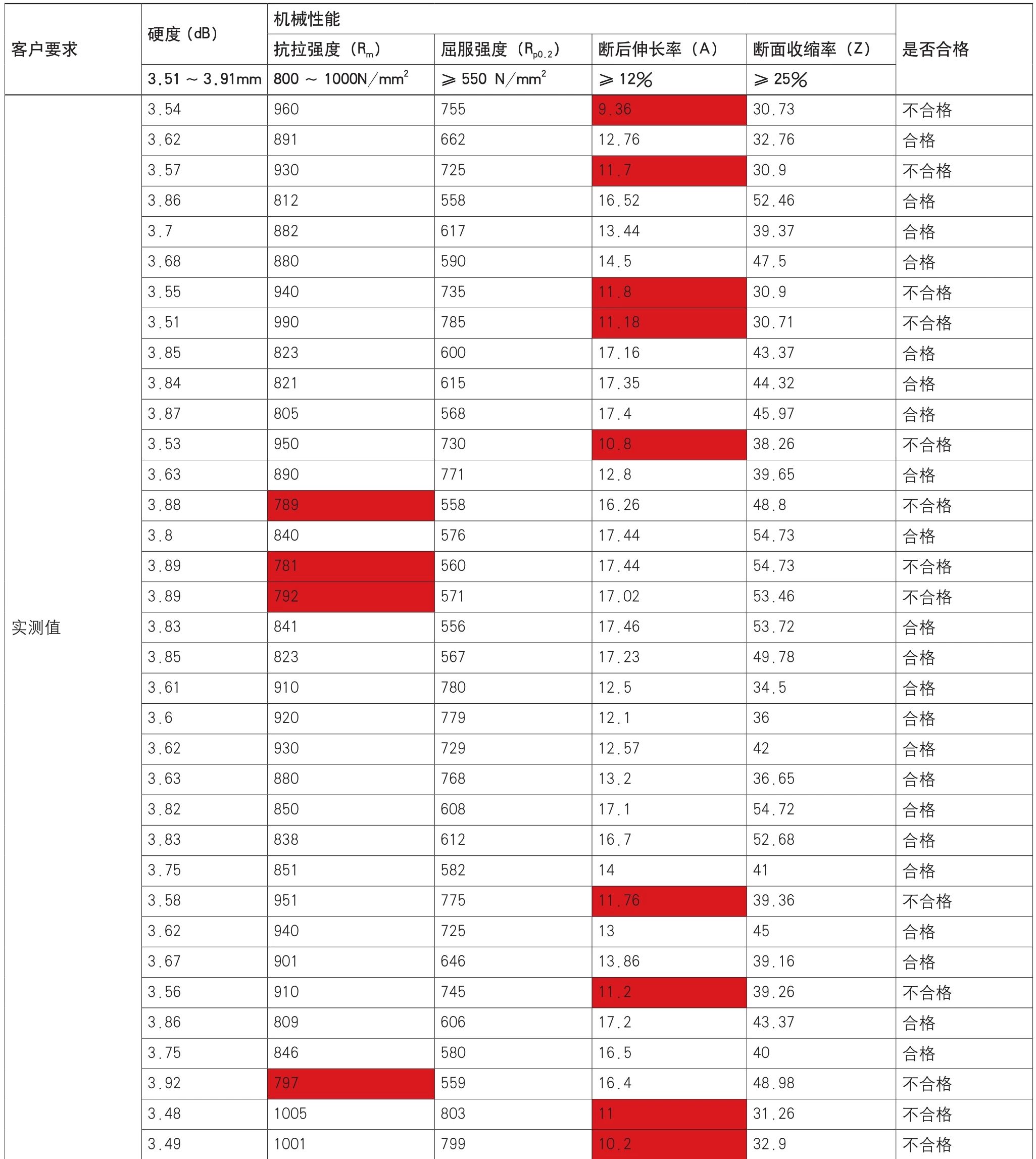 将抗拉强度(Rm)及硬度的关系做折线图表示,从图6中可以看出,当硬度dB<3.51mm时,Rm不合格,dB>3.87mm时,Rm不合格。当硬度在dB=3.51~3.87mm之间时Rm合格。为加严控制,故生产中将硬度范围确定为dB=3.64~3.84mm。