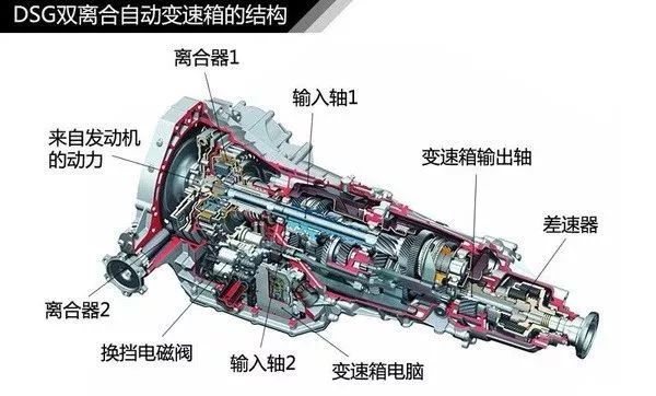 DSG自动变速箱:图11是一个大众6速DSG双离合变速箱的工作原理图。两个离合器与变速箱装配在同一机构内,其中一个离合器(1)负责挂1、3、5和倒挡;另一个离合器(2)负责挂2、4、6挡。当驾驶员挂上1挡起步时,换挡拨叉同时挂上1挡和2挡,但离合器1结合,离合器2分离,动力通过1挡的齿轮输出动力,2挡齿轮空转。
