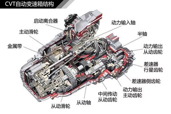 CVT自动变速箱:CVT无级变速箱的主要部件是两个滑轮和一条金属带,金属带套在两个滑轮上。滑轮由两块轮盘组成,这两片轮盘中间的凹槽形成一个V形,其中一边的轮盘由液压控制机构控制,可以视不同的发动机转速,进行分开与拉近的动作。