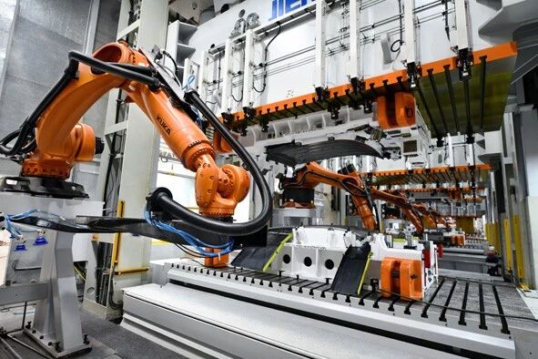 以冲压车间为例,两条全封闭高速同步机械冲压线,不仅可以满足钢铝混线生产,而且仅需5秒就可以冲压完成一个部件,速度远远超过了传统的汽车冲压生产线。