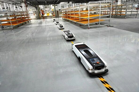 工厂内的汽车零部件等生产物料,主要使用了激光自动导航无人车进行运输配送。总装车间的部分零部件,还通过运输链条直接从地下仓库送到了生产线上,既高效又精准。
