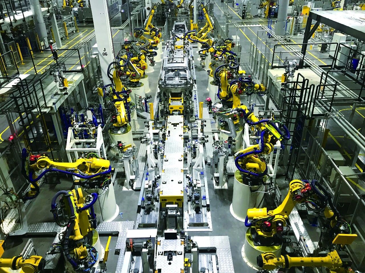 焊装车间也采用了世界一流的焊接生产线。生产线的上料、输送、焊接、涂胶这些工作全部实现自动化,焊接的自动化率达到100%。整个车间工人的数量仅是传统汽车焊装车间的三分之一左右。