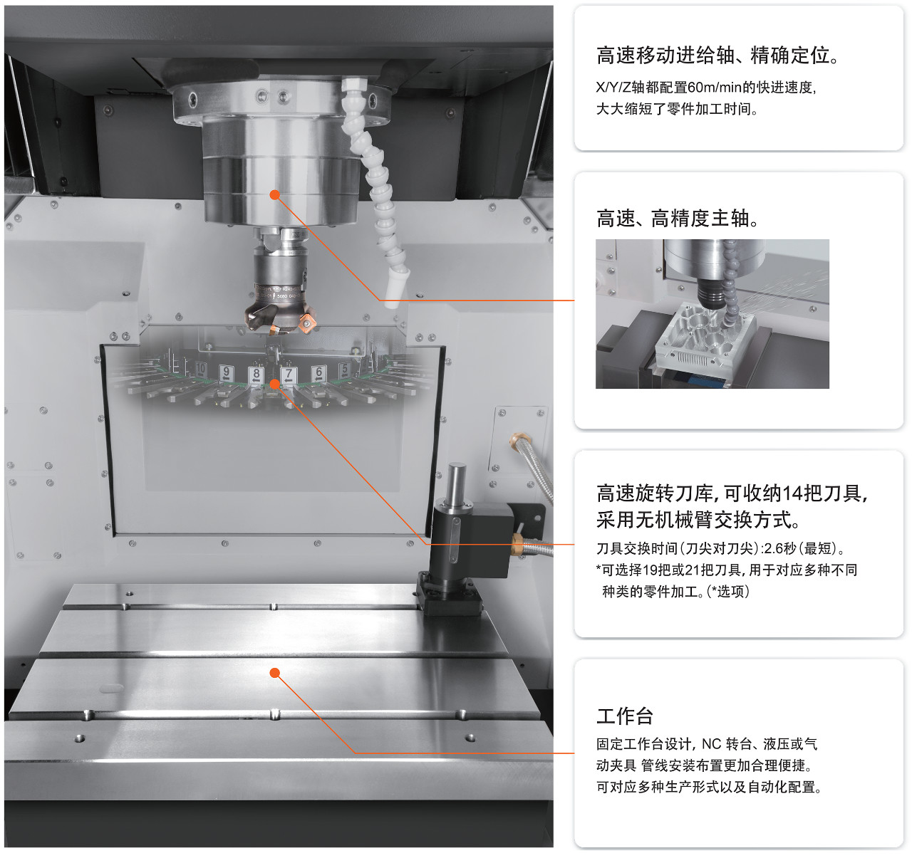 每一款主轴都在原基础上提高了性能与刚性,采用伺服电机直联驱动,主轴振动小,加工精度更高。