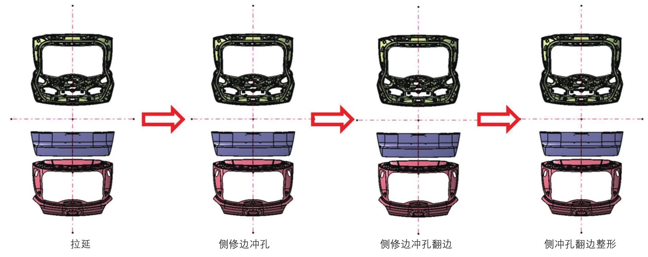 为了充分利用大型冲压设备,提高生产效率,后背门内板、后背门外板-上部两个件采用一模双槽的工艺规划方案,共需四道工序分别为拉延、侧修边冲孔、侧修边冲孔翻边、侧冲孔翻边整形,如图2所示。